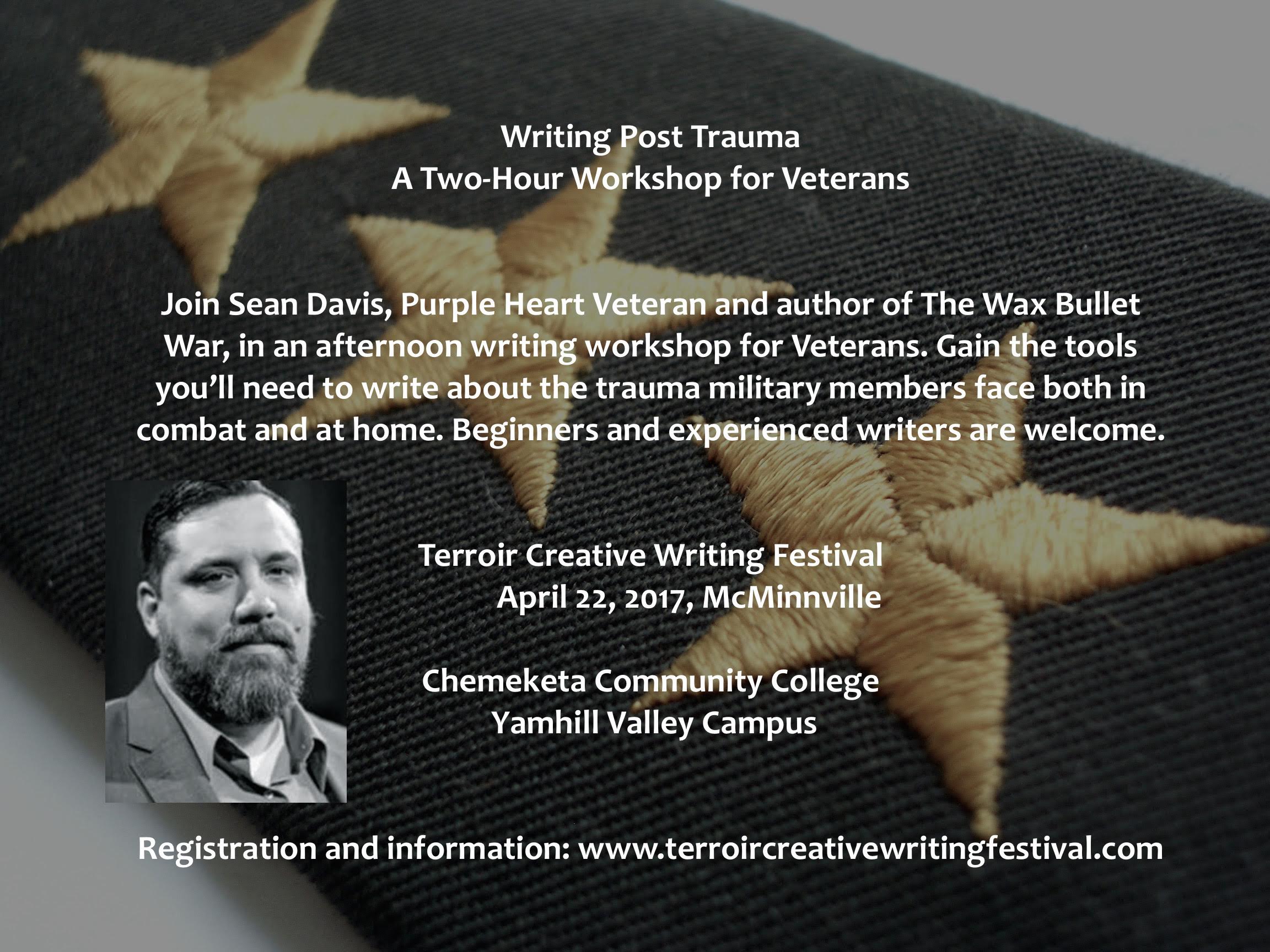 We’re doing something really special at this year’s Terroir Creative Writing Festival. We’re hosting Sean Davis, a Purple Heart Veteran and author of The Wax Bullet War. Sean will be leading a workshop for veterans focused on trauma.